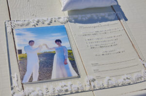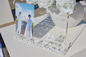 🤵🏻👰🏻 ② クリアの板の結婚証明書|光をまとって輝く、屋外人前式にぴったり