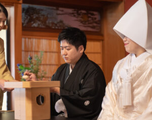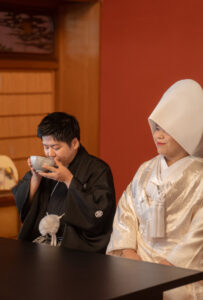 ① 夫婦固めの儀:ひとつの茶碗で、新郎→新婦の順にお茶を飲む